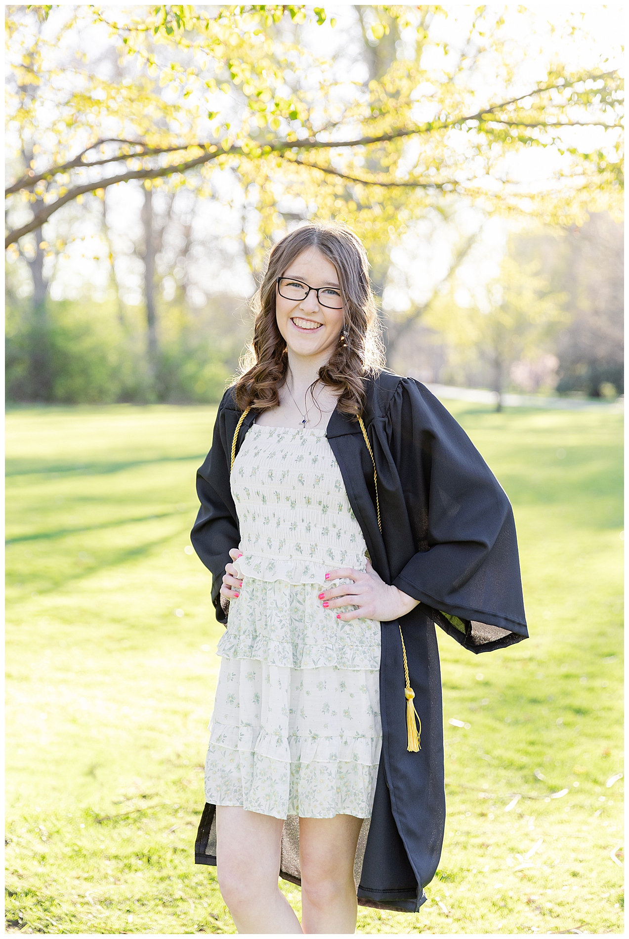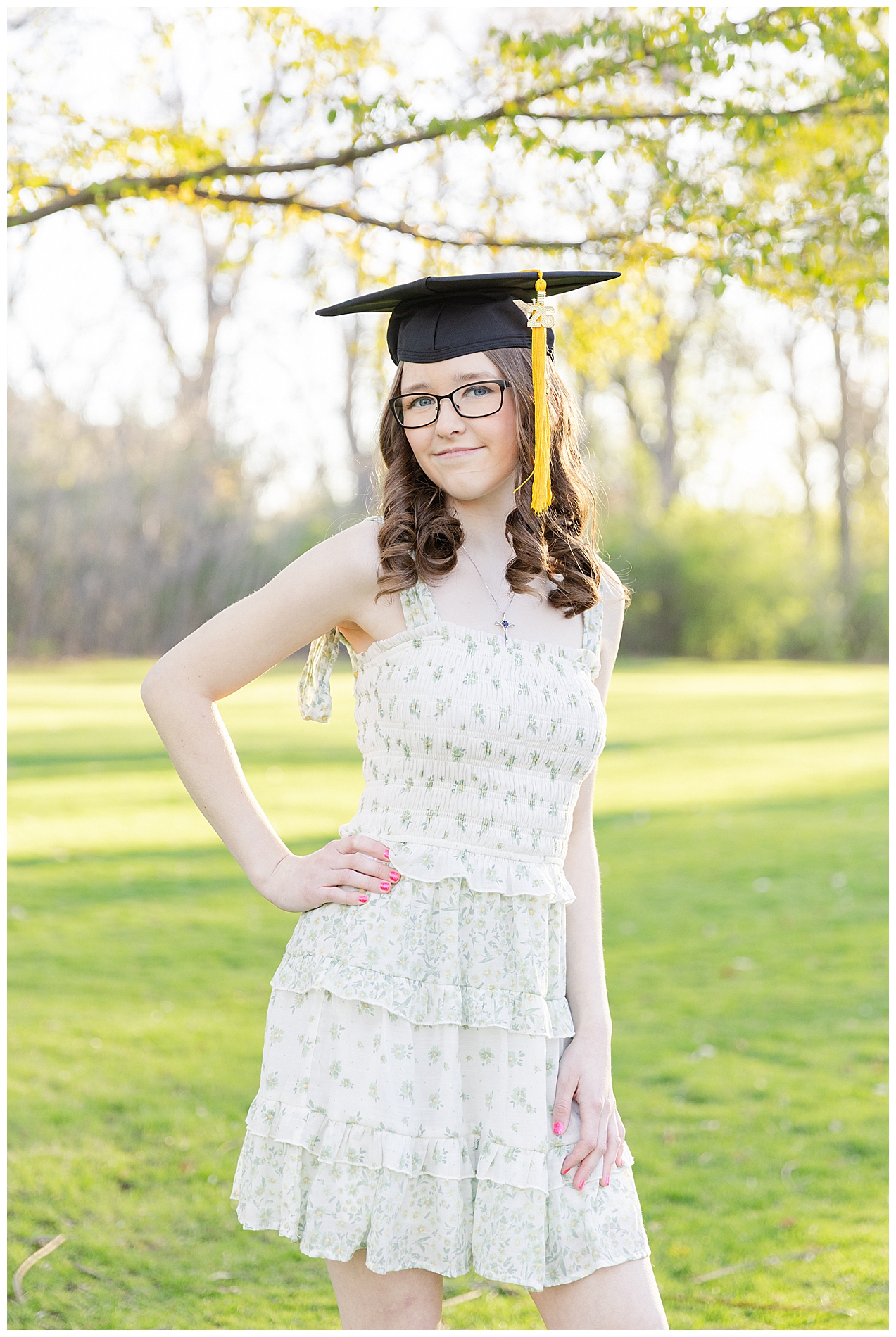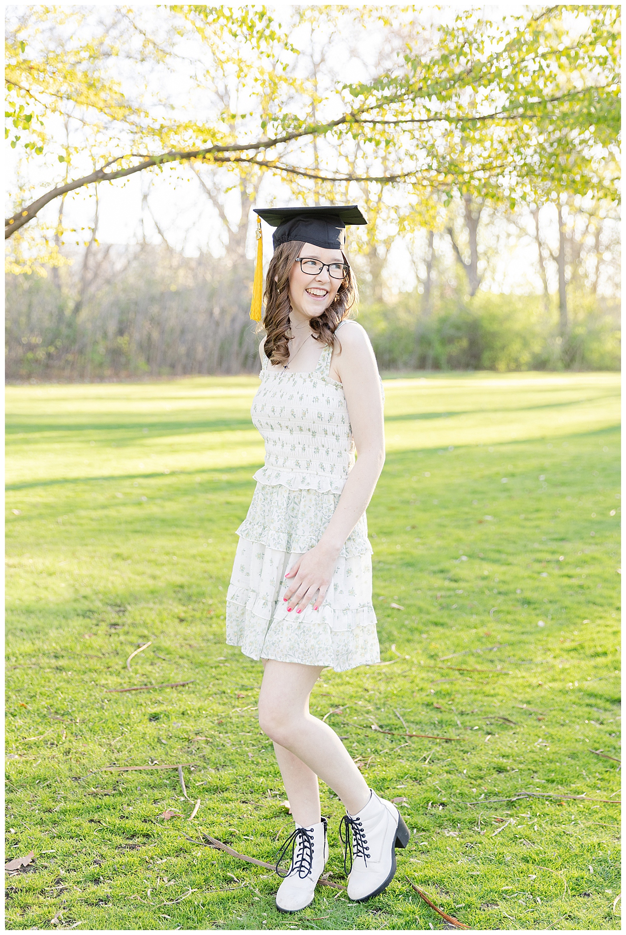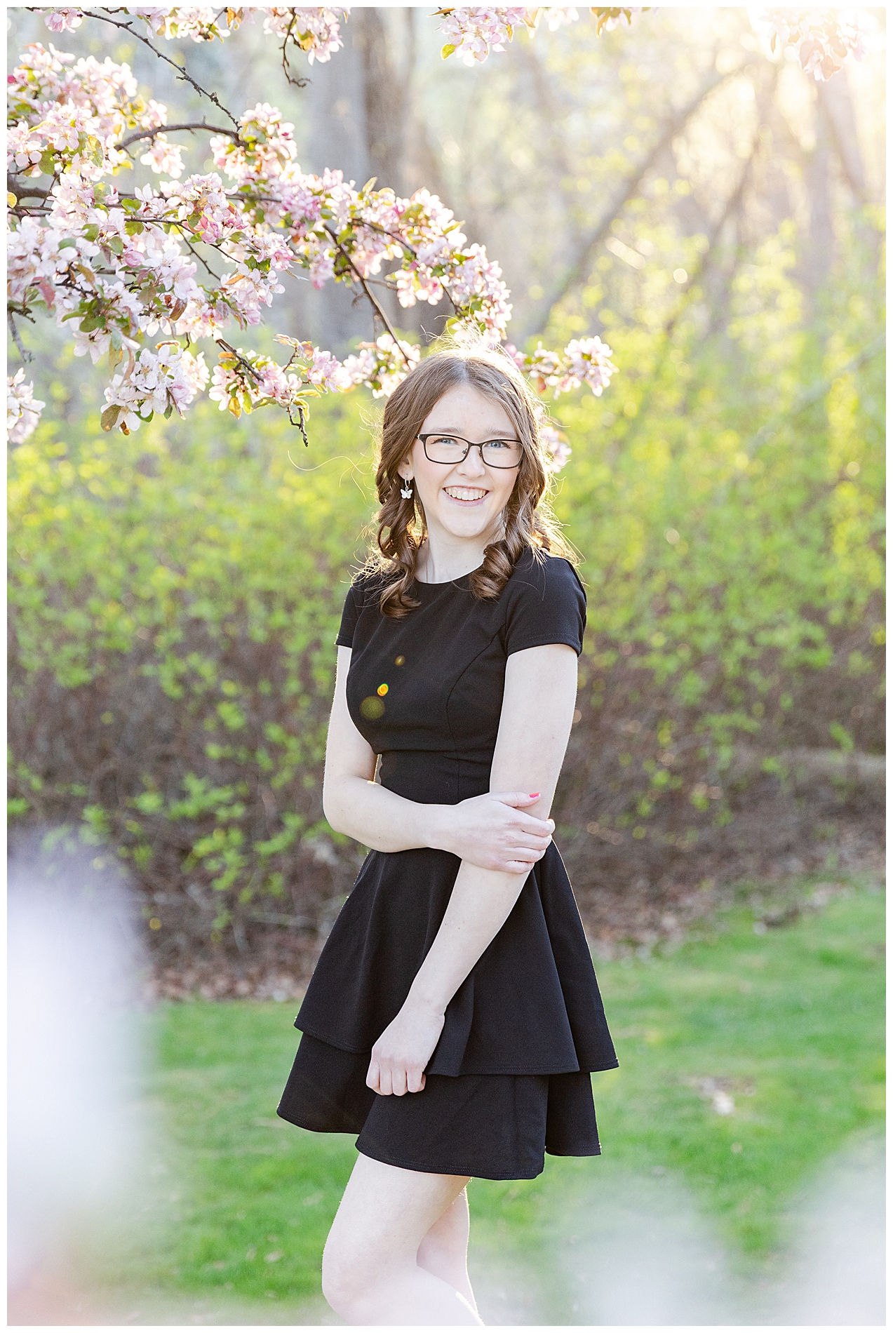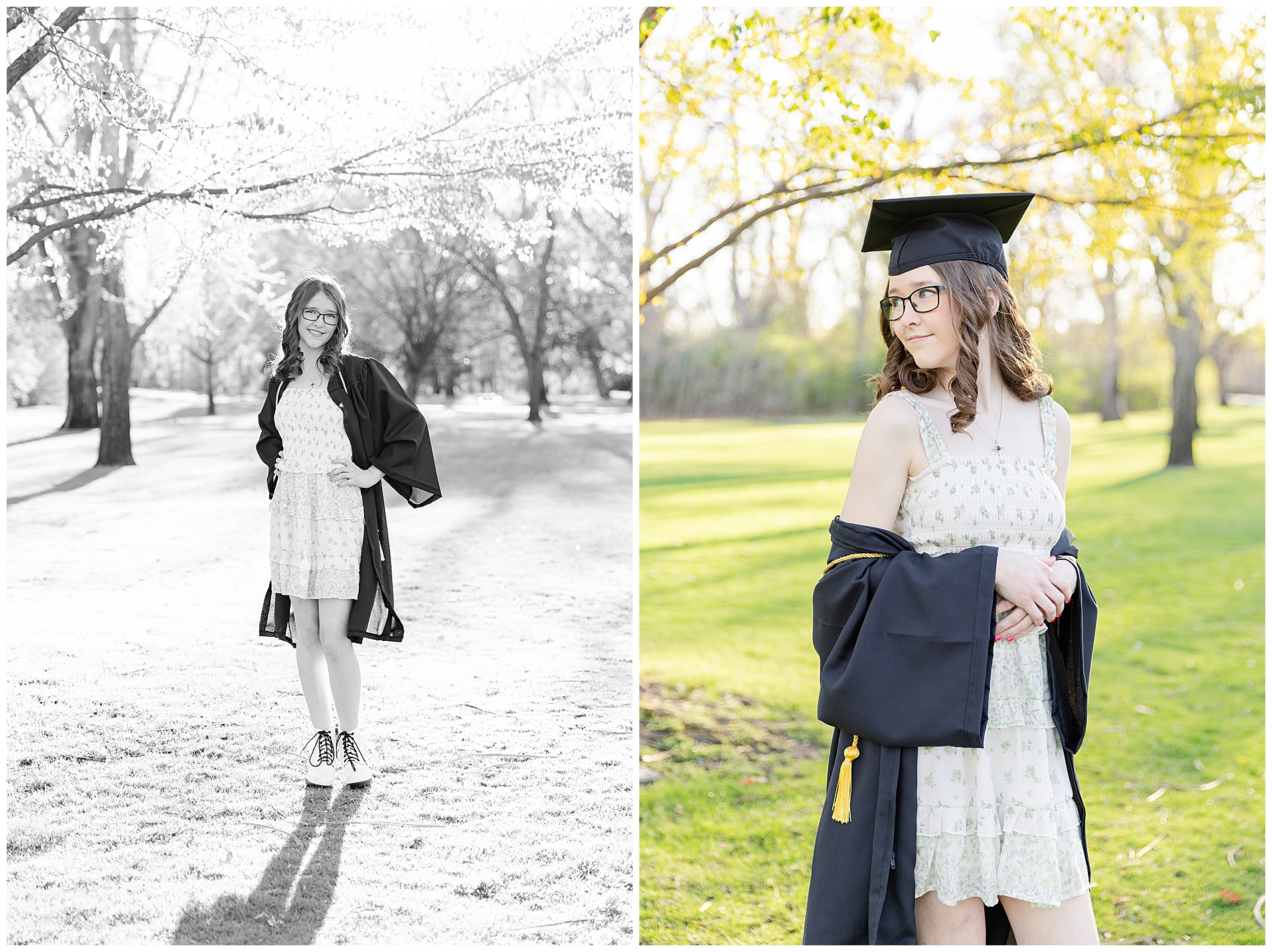 For her outfits, Olivia wore a lacy pink blouse and jeans, a white and green floral sundress, and a solid black dress. She also brought a black leather jacket that she paired with the sundress for a few photos. I thought it made for a nice contrast, adding a bit of edge to the delicate, feminine dress. We also took some photos with her black cap and gown. I didn’t plan it this way, but by that time, the afternoon sunlight lit up the trees’ new leaves and it brought out the golden yellow in her honor cords and tassel.