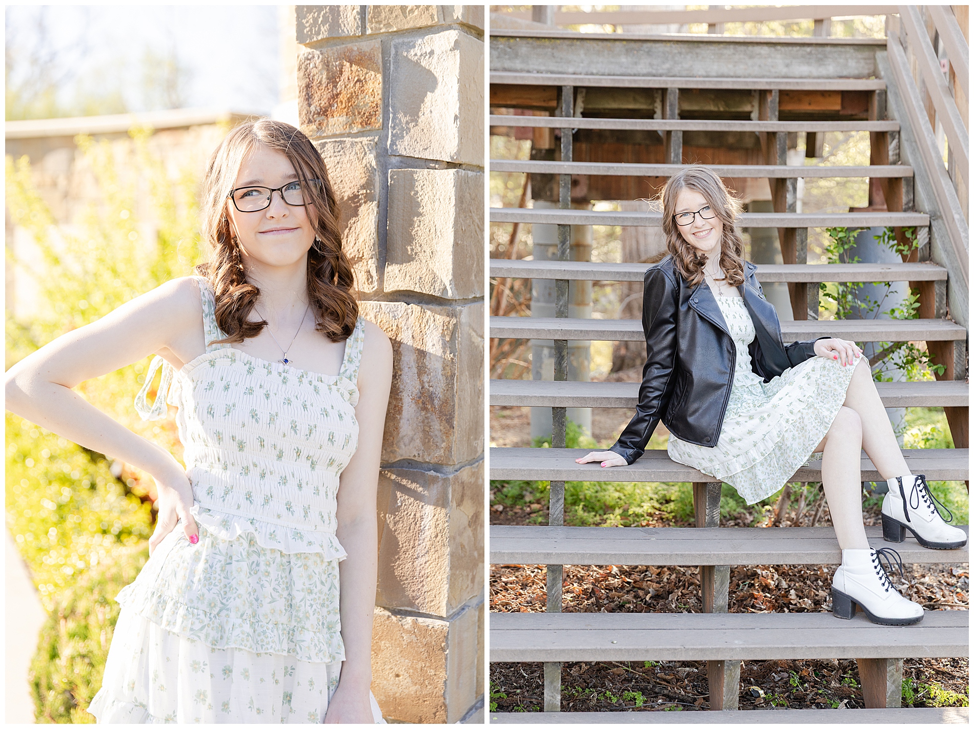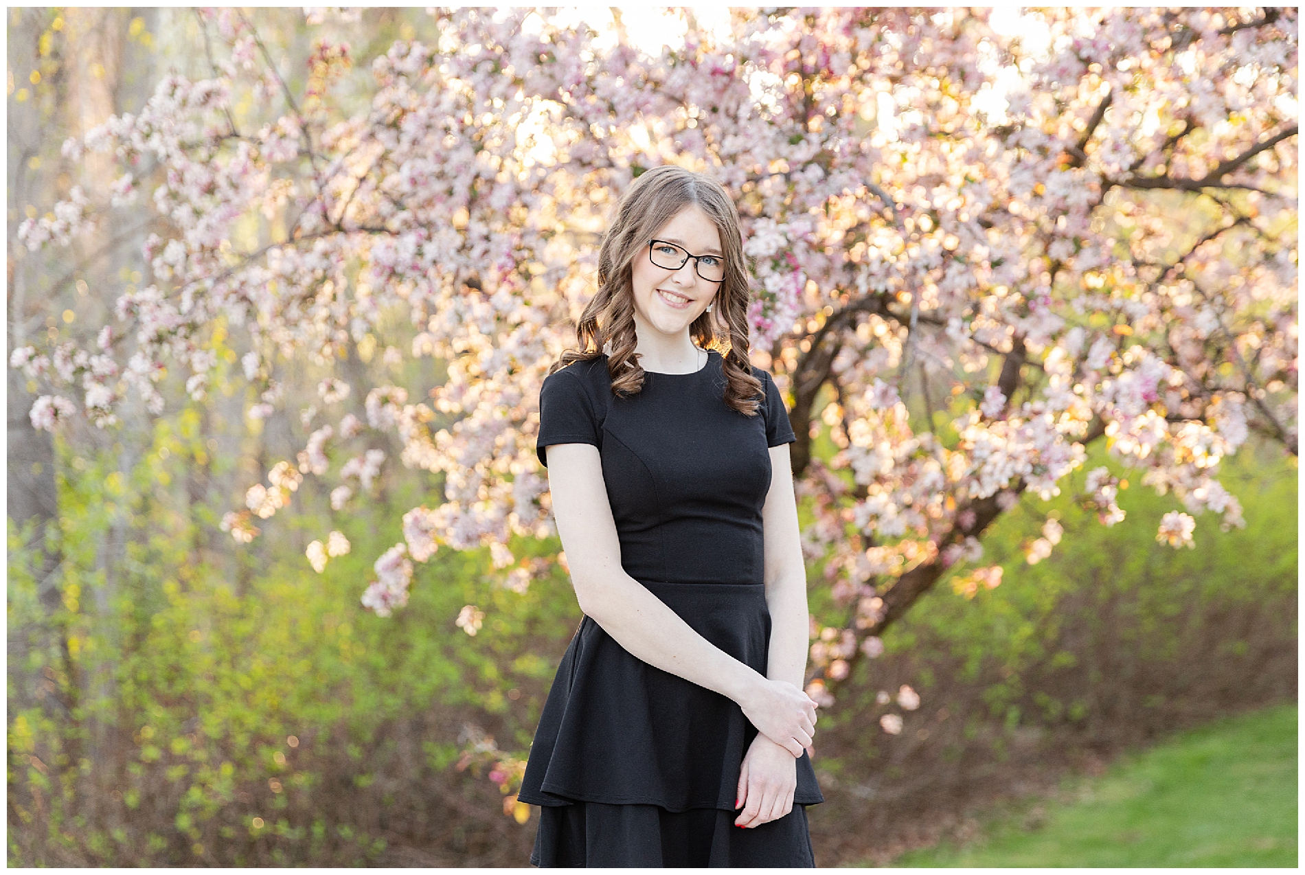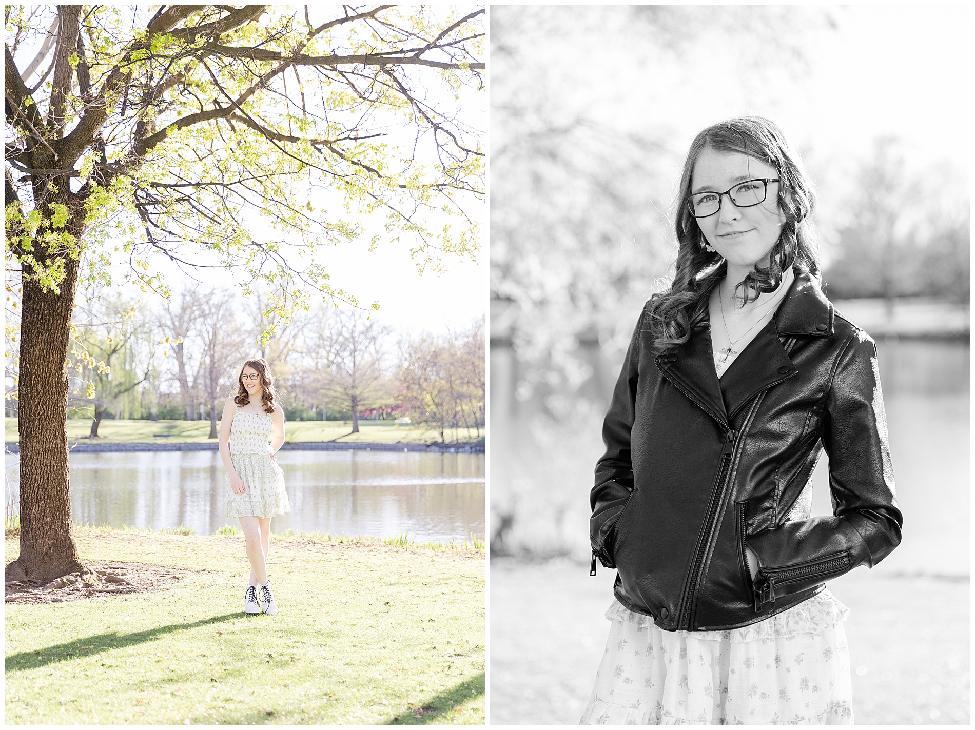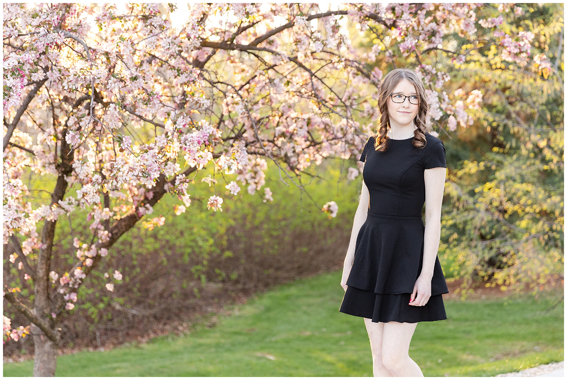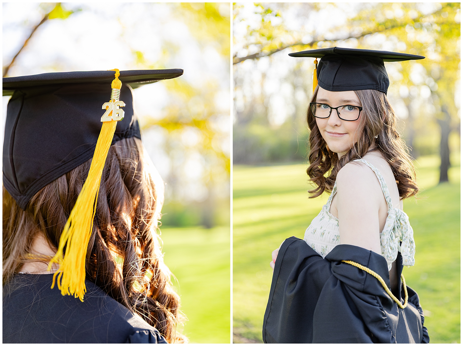 For her outfits, Olivia wore a lacy pink blouse and jeans, a white and green floral sundress, and a solid black dress. She also brought a black leather jacket that she paired with the sundress for a few photos. I thought it made for a nice contrast, adding a bit of edge to the delicate, feminine dress. We also took some photos with her black cap and gown. I didn’t plan it this way, but by that time, the afternoon sunlight lit up the trees’ new leaves and it brought out the golden yellow in her honor cords and tassel.