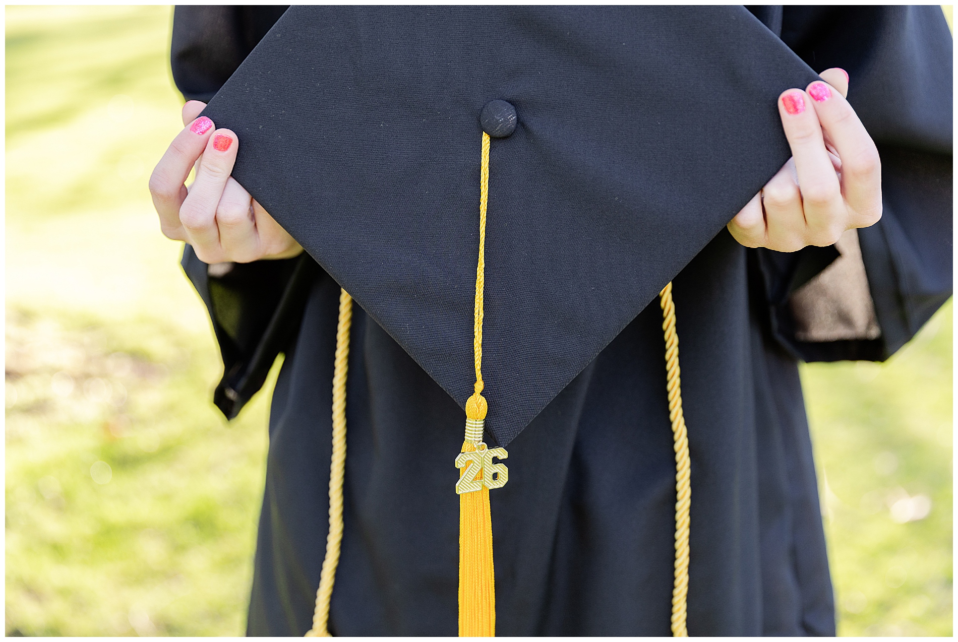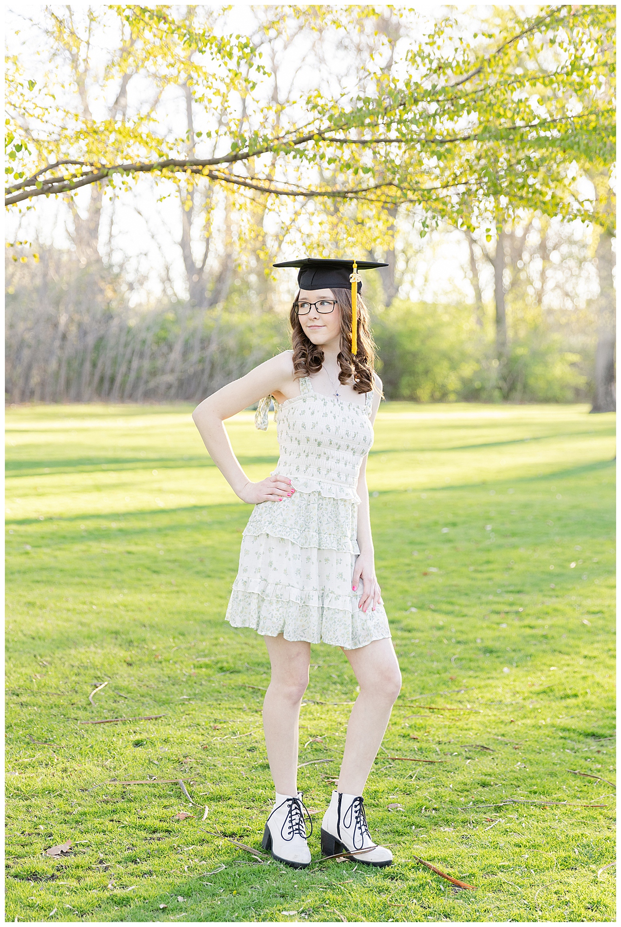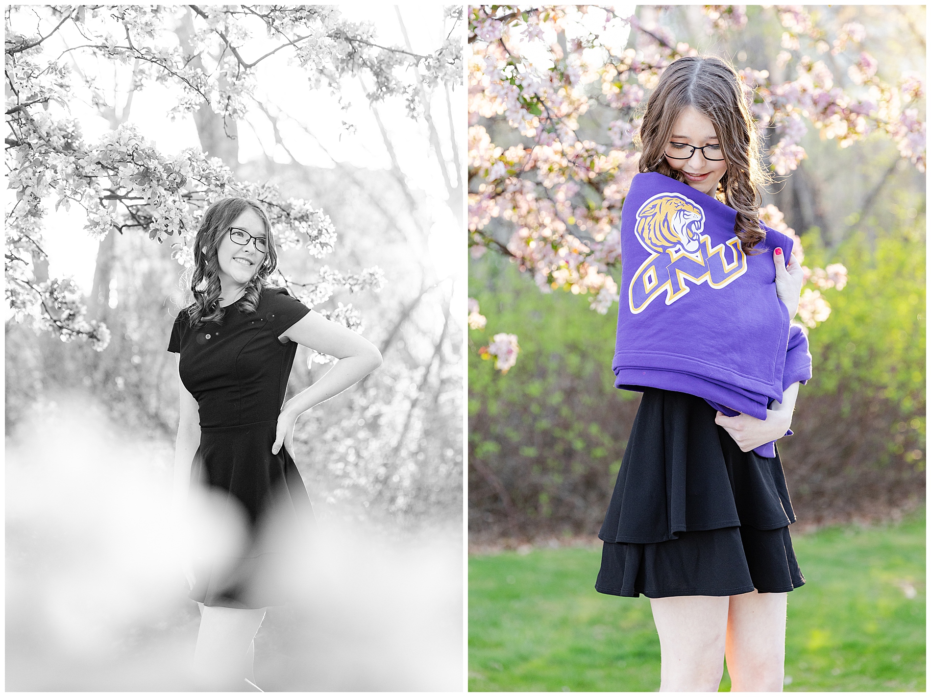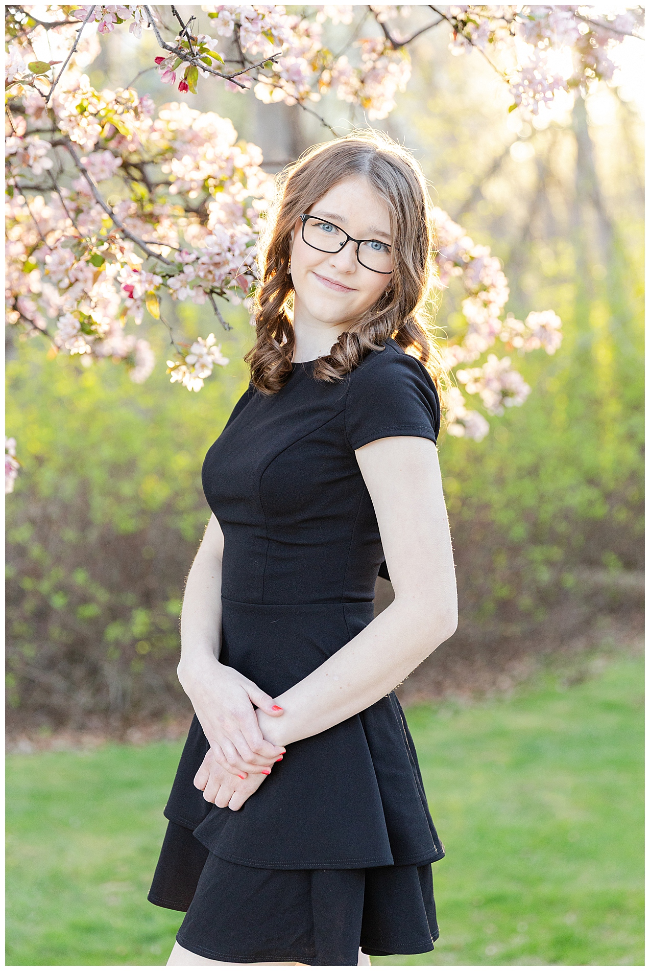 For her outfits, Olivia wore a lacy pink blouse and jeans, a white and green floral sundress, and a solid black dress. She also brought a black leather jacket that she paired with the sundress for a few photos. I thought it made for a nice contrast, adding a bit of edge to the delicate, feminine dress. We also took some photos with her black cap and gown. I didn’t plan it this way, but by that time, the afternoon sunlight lit up the trees’ new leaves and it brought out the golden yellow in her honor cords and tassel.