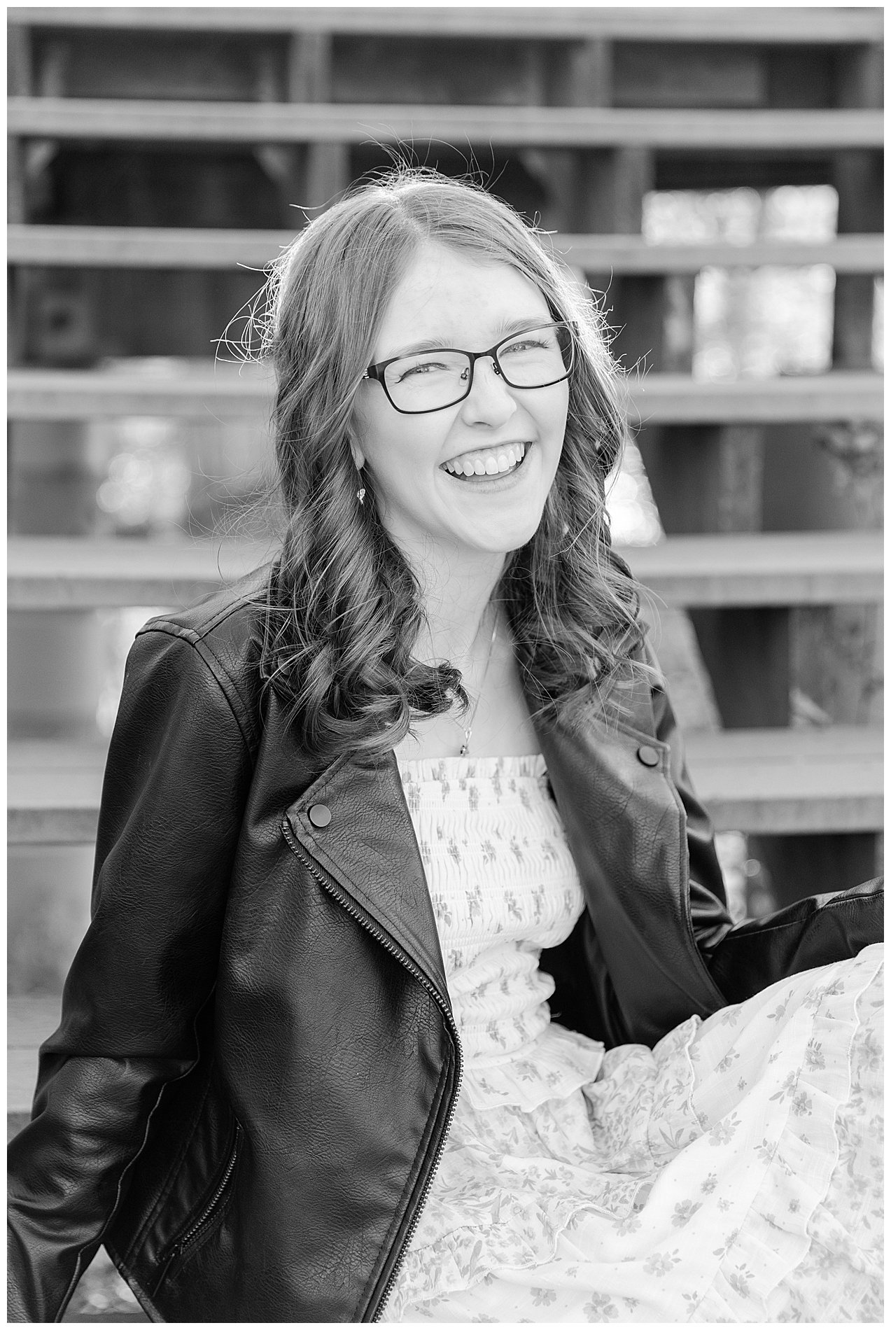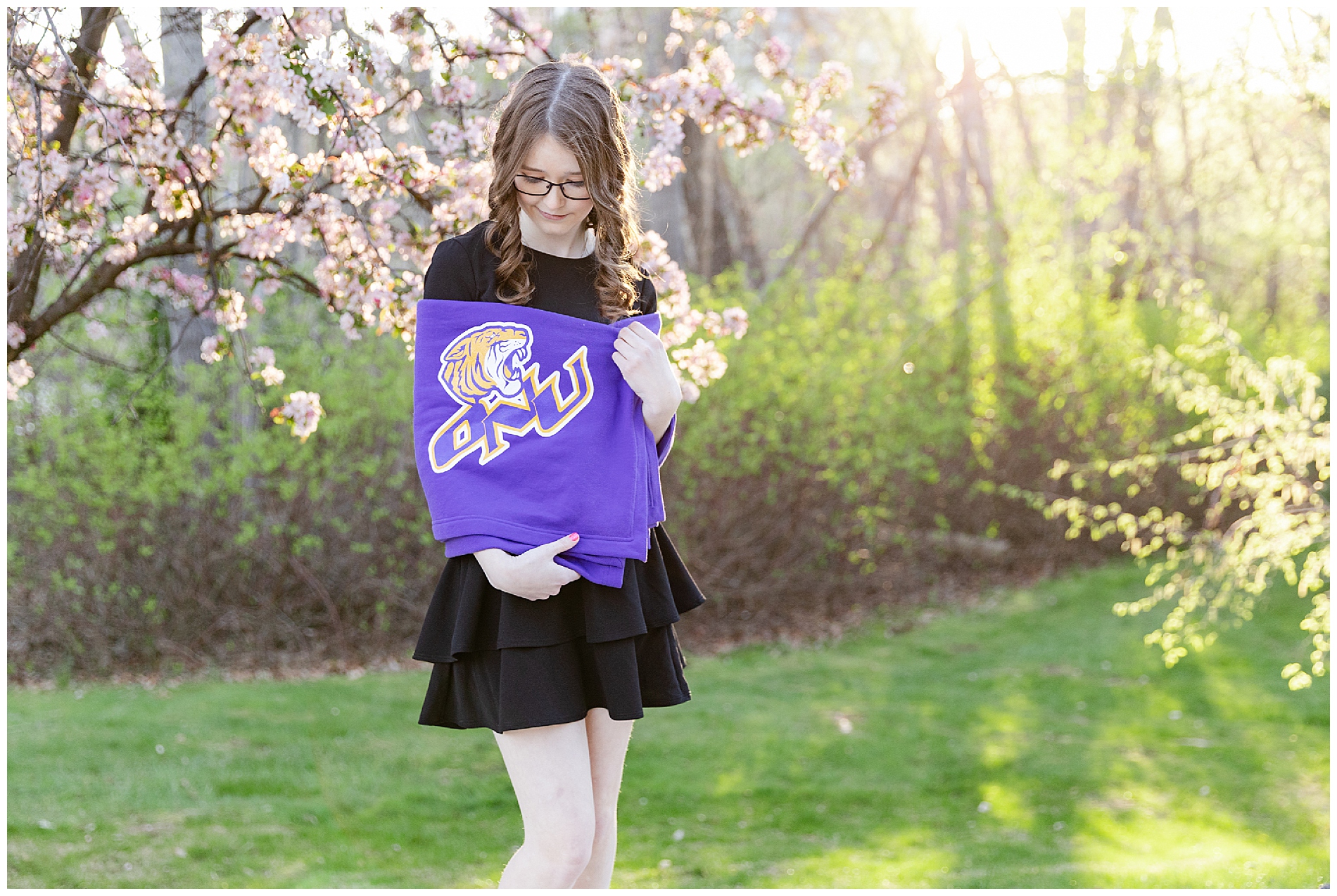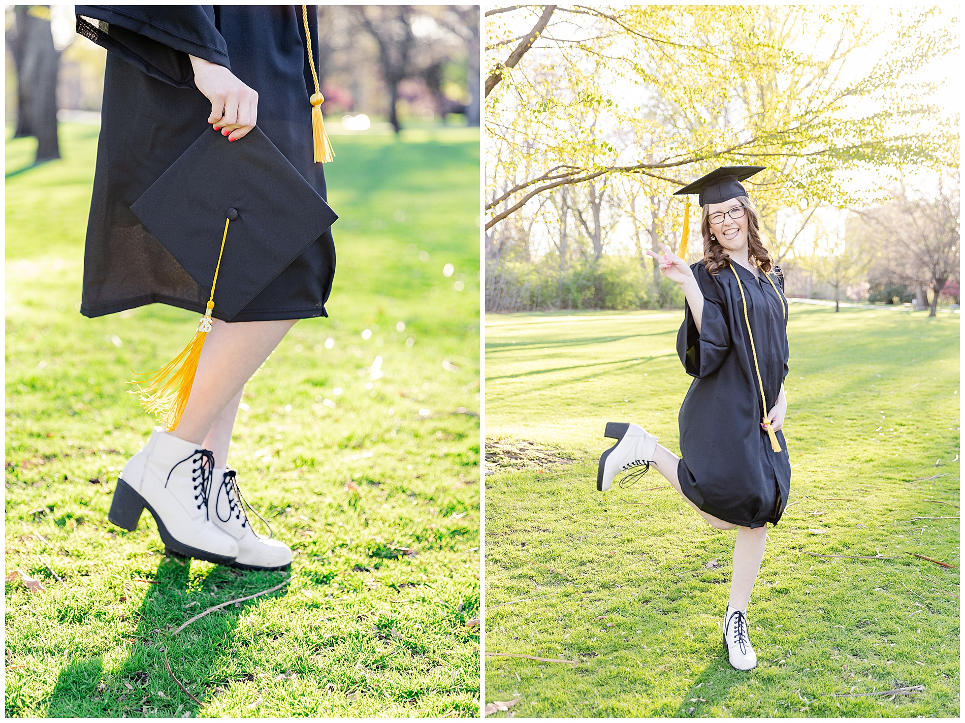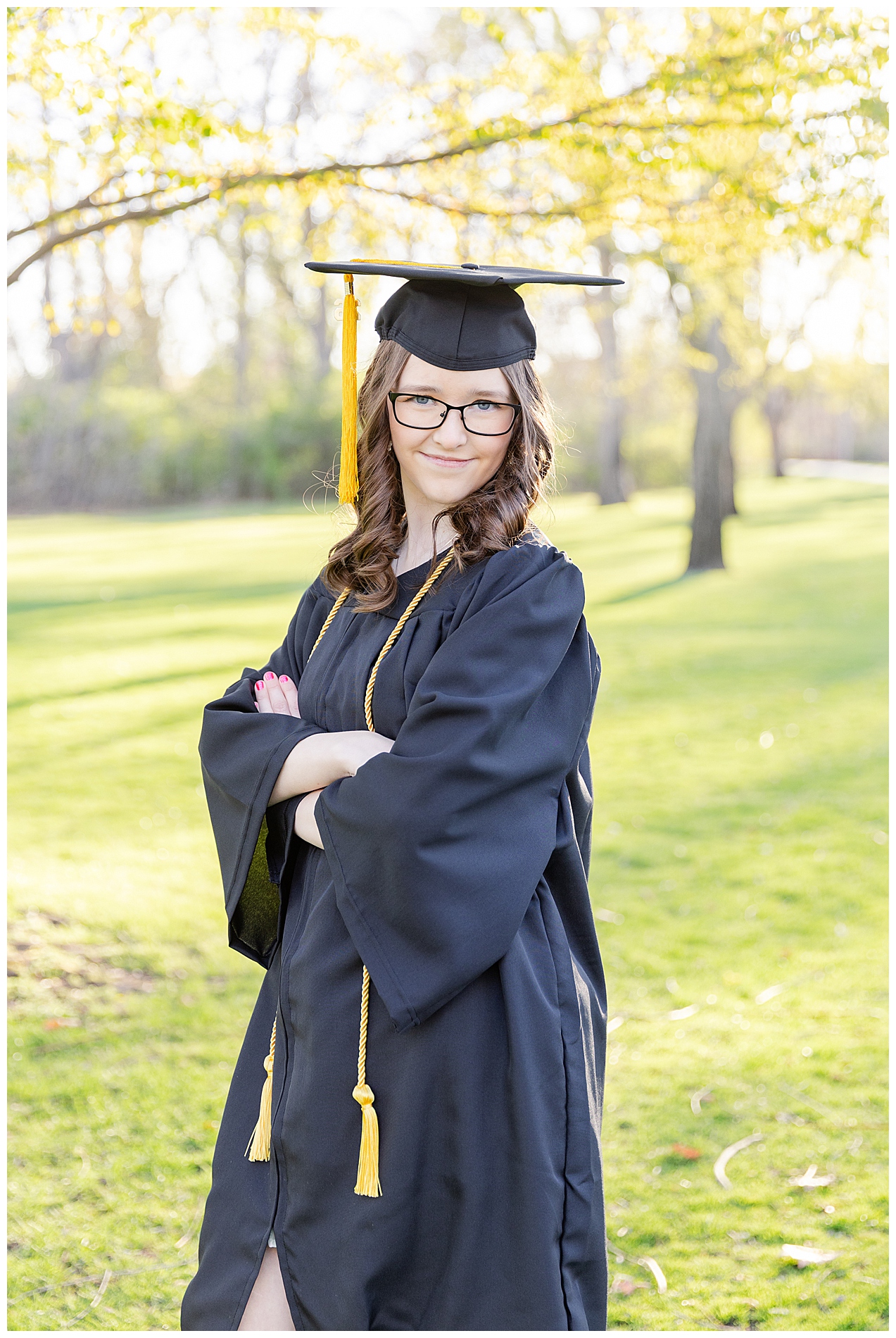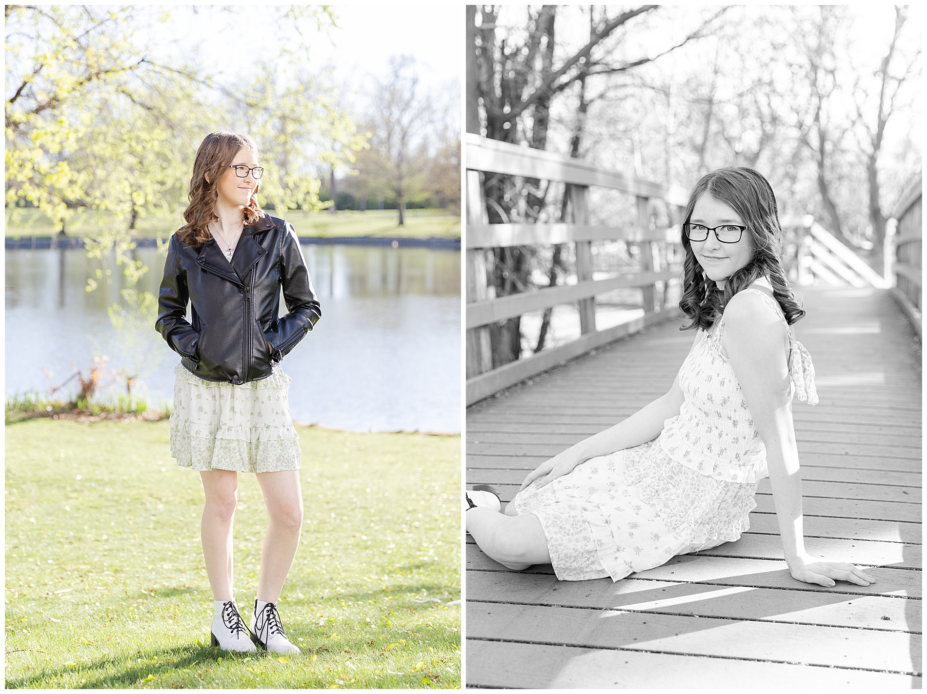 For her outfits, Olivia wore a lacy pink blouse and jeans, a white and green floral sundress, and a solid black dress. She also brought a black leather jacket that she paired with the sundress for a few photos. I thought it made for a nice contrast, adding a bit of edge to the delicate, feminine dress. We also took some photos with her black cap and gown. I didn’t plan it this way, but by that time, the afternoon sunlight lit up the trees’ new leaves and it brought out the golden yellow in her honor cords and tassel.