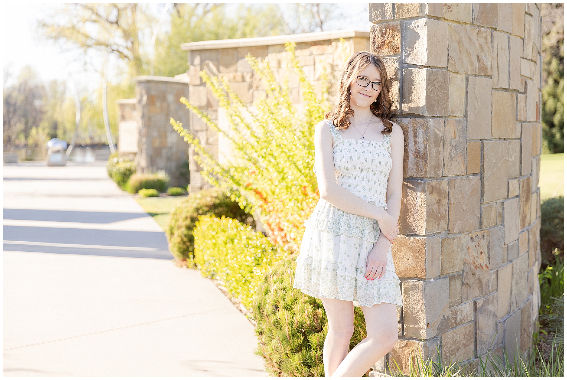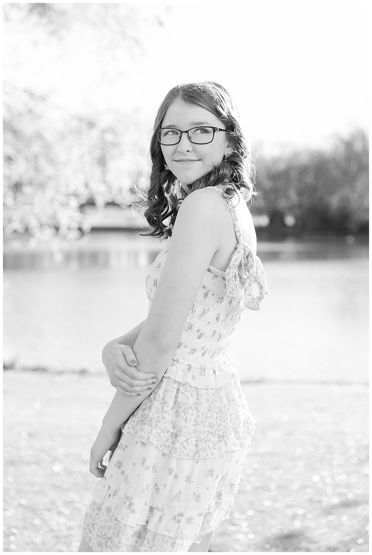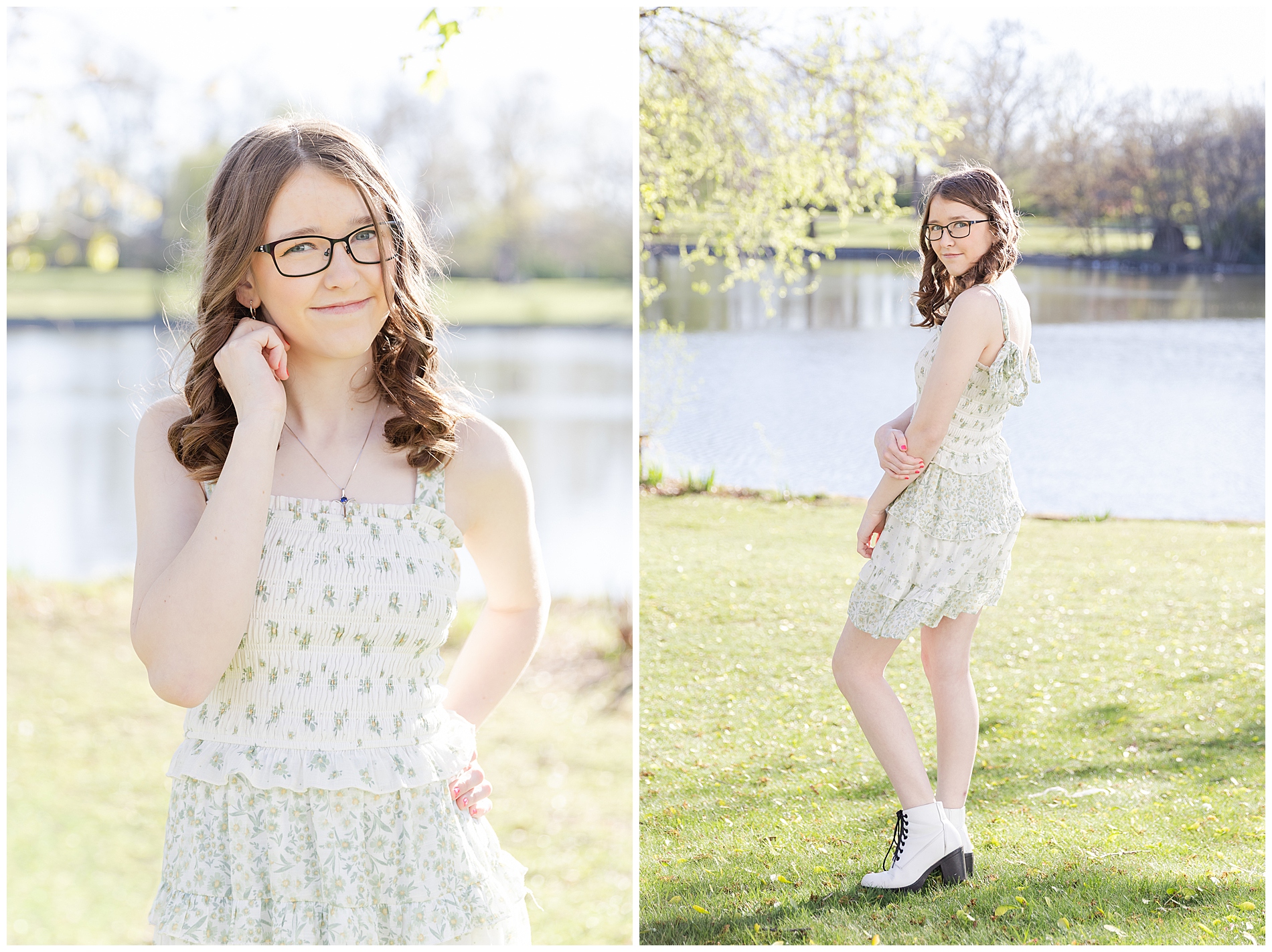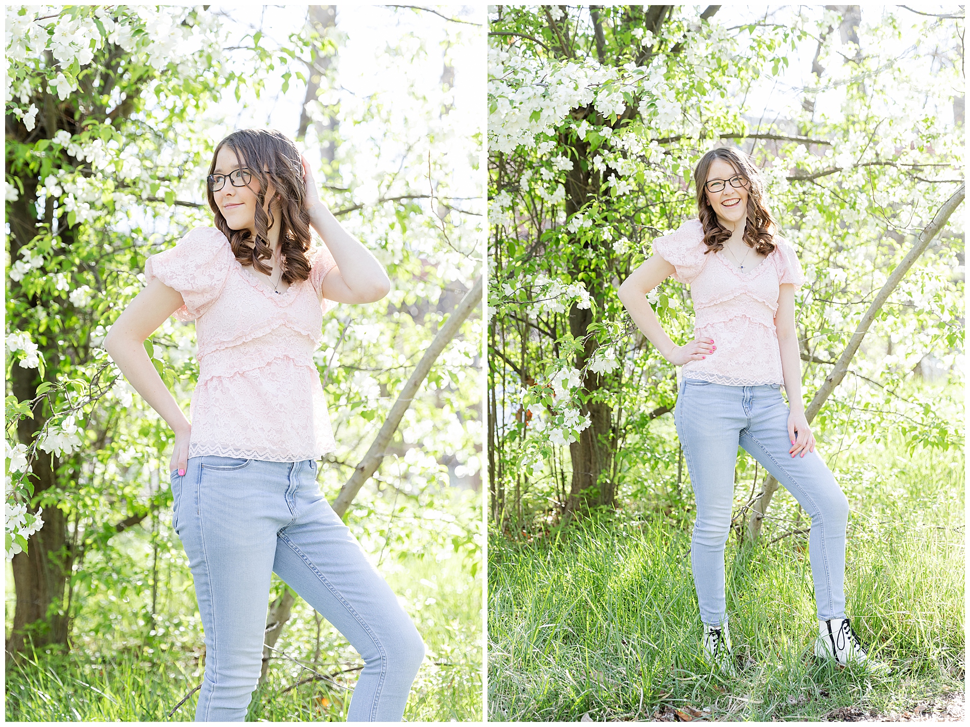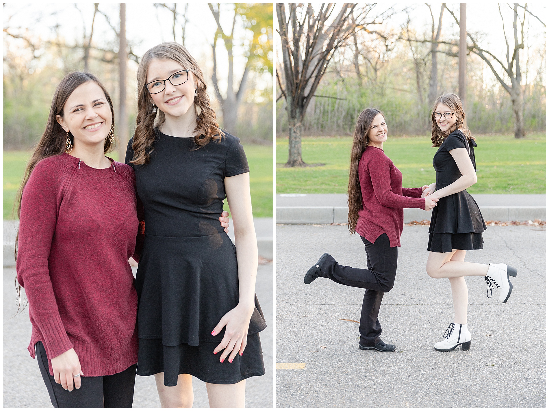 For her outfits, Olivia wore a lacy pink blouse and jeans, a white and green floral sundress, and a solid black dress. She also brought a black leather jacket that she paired with the sundress for a few photos. I thought it made for a nice contrast, adding a bit of edge to the delicate, feminine dress. We also took some photos with her black cap and gown. I didn’t plan it this way, but by that time, the afternoon sunlight lit up the trees’ new leaves and it brought out the golden yellow in her honor cords and tassel.